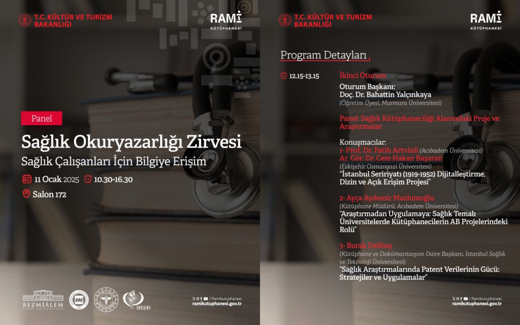 İSTANBUL SERİRİYATI, SAĞLIK OKURYAZARLIĞI ZİRVESİ’NDE Rami Kütüphanesi’nde 11 Ocak 2025 günü gerçekleştirilen Sağlık Okuryazarlığı Zirvesi’nde İstanbul Seririyatı projesi tanıtıldı. Sağlık Çalışanları İçin Bilgiye Erişim altbaşlığı ile düzenlenen toplantıda, Sağlık Kütüphaneciliği Alanındaki Proje ve Araştırmalar’a ayrılan oturumda, Fatih Artvinli ve Cem Hakan Başaran tarafından “İstanbul Seririyatı (1919-1952): Tıbbi Süreli Yayın Dijitalleştirme, Dizin ve Açık Erişim Projesi”…