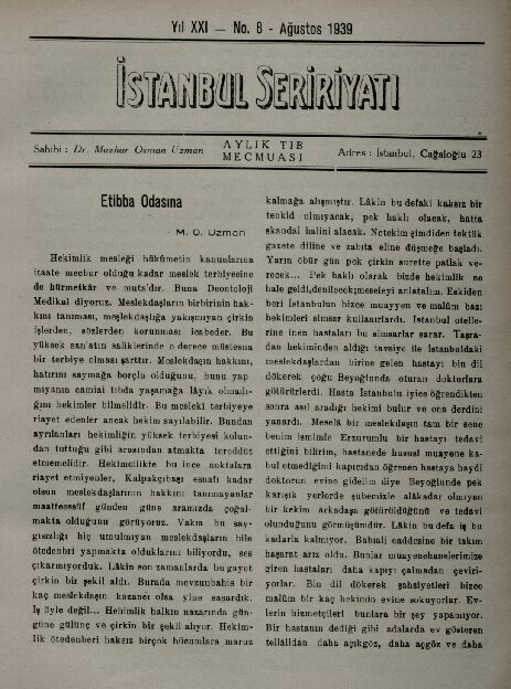 İstanbul Seririyatı-Sene 21-No:8-1939 İstanbul Seririyatı-Sene 21-No:8-1939 Download İstanbul Seririyatı-Sene 21-No:8-1939 (Paramedikal) Download İstanbul Seririyatı-Sene 21-No:8-1939 İstanbul Seririyatı-Sene 21-No:8-1939 (Paramedikal) Bilgi Başlıkİstanbul Seririyatı-Sene 21-No:8-1939AçıklamaMakalat 1) Üstad Mazhar Osman’ın Jübilesi (Türk Nöropsihiatri Cemiyeti’nde 30/7/1939 tarihinde, Prof. Nazım Şakir Şakar’ın nutku, Dr. Hüseyin Kenan Tunakan’ın nutku, Dr. İhsan Şükrü Aksel’ın nutku, Ord. Prof. Mazhar Osman’ın Tababeti Hazıra’daki makaleleri, Sıhhi Sahifeler’deki makaleleri, Gülhane’deki neşriyatı, İstanbul Seririyatı’ndaki makaleleri, Prof. Mazhar Osman’ın cevabı, törenden ve Mazhar Osman Bey’ın hayatından muhtelif fotoğraflar) [s.157-178] 2) Yirmi beş senelik bir baştabip /Fahri Celal Göktulga [s.178-180] 3) Ruhî tababet (Akşam’dan) /Dr. Rasim Adasal [s.180-182] 4) Ord. Prof. Mazhar Osman Uzman’ın jübilesi (Jamanak’dan) /Şişli Lape Hastanesi Eczacısı: N. Tozan [s.182-184] Künye Yayın Yılı1939Yayın AyıAğustosSayı8DilTürkçeEtiketJübile, Nöropsihiatri, Nutuk, Tababet, Makaleler, Sıhhi Sahifeler, Neşriyat, İstanbul Seririyatı, Ruhî Tababet, Baştabip, Üstad Mazhar Osman, Prof. Nazım Şakir Şakar, Dr. Hüseyin Kenan Tunakan, Dr. İhsan Şükrü Aksel, Fahri Celal Göktulga, Dr. Rasim Adasal, N. Tozan. Previous itemİstanbul Seririyatı-Sene 21-No:7-1939 Next itemİstanbul Seririyatı-Sene 21-No:9-1939